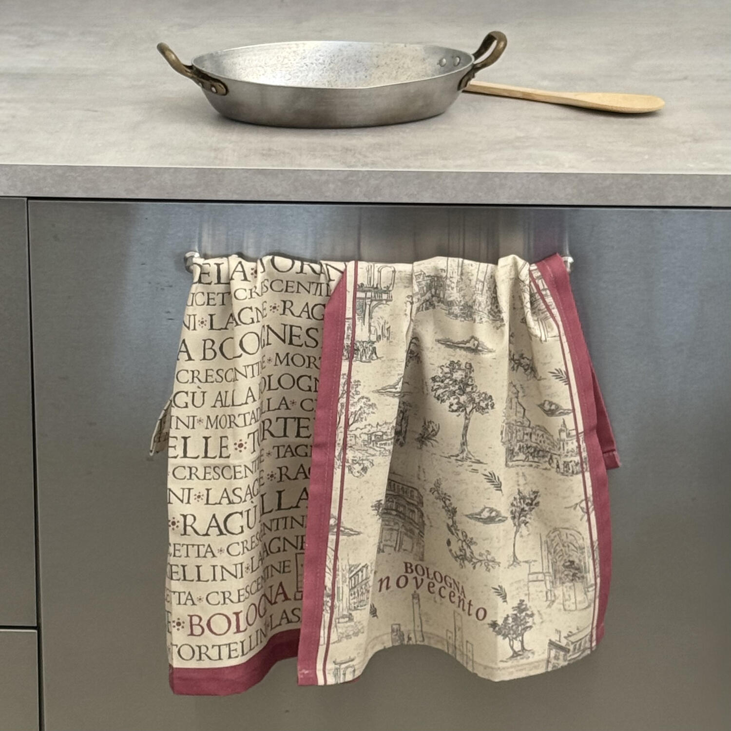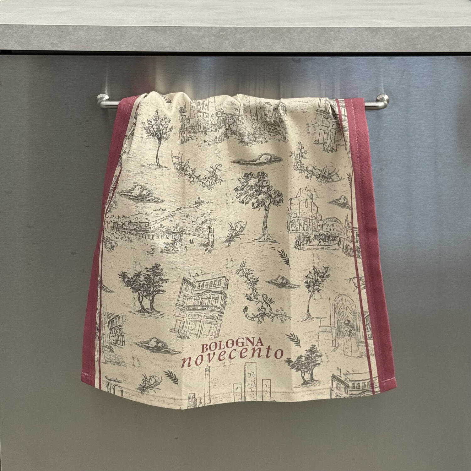 Tutto il fascino delle antiche stampe in stile francese, le così dette Toile de Jouy, interpretate in una versione che racconta la Bologna dei primi del secolo scorso: i portici, la piazza, la Basilica di San Luca in lontananza e le torri, quando ancora erano 5!