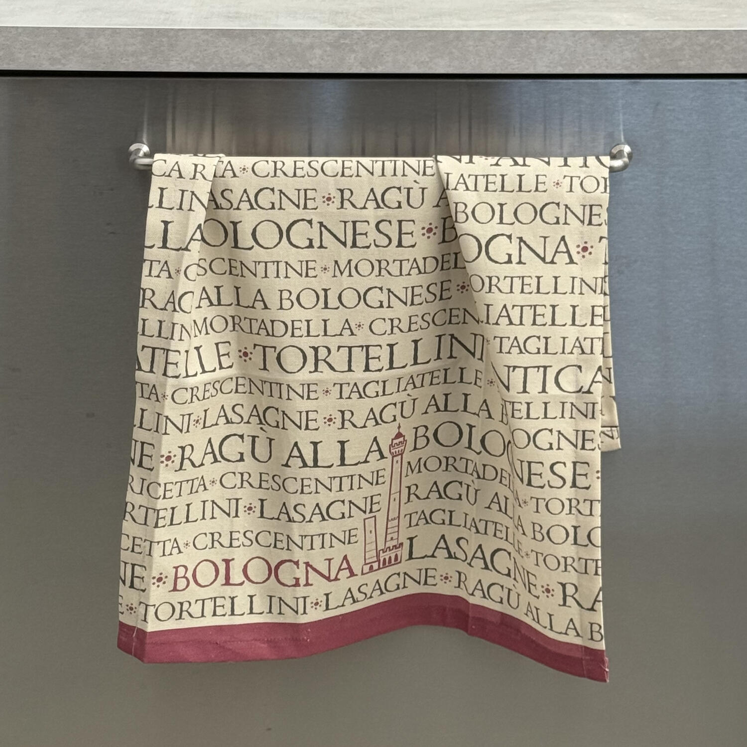Un pattern dedicato alla cucina bolognese, ai tradizionali piatti tipici e alle eccellenze gastronomiche del territorio. Lo strofinaccio è in cotone con stampa all-over. Misura 40x60 cm, 100% cotone. Ideato e prodotto da Unico in Serie.