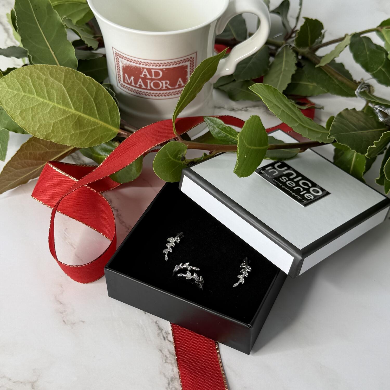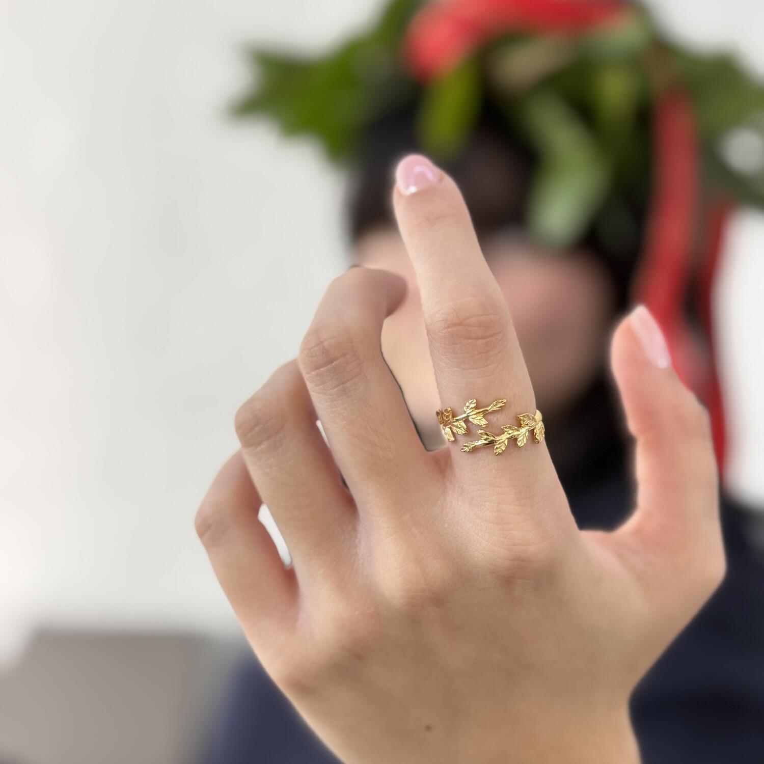 Un anello elegate, sofisticato e particolarmente brillante. Le foglie di alloro sono un omaggio ad un obiettivo accademico raggiunto e, al contempo, un augurio per il futuro. Sono abbinabili agli orecchini (acquistabili separatamente).